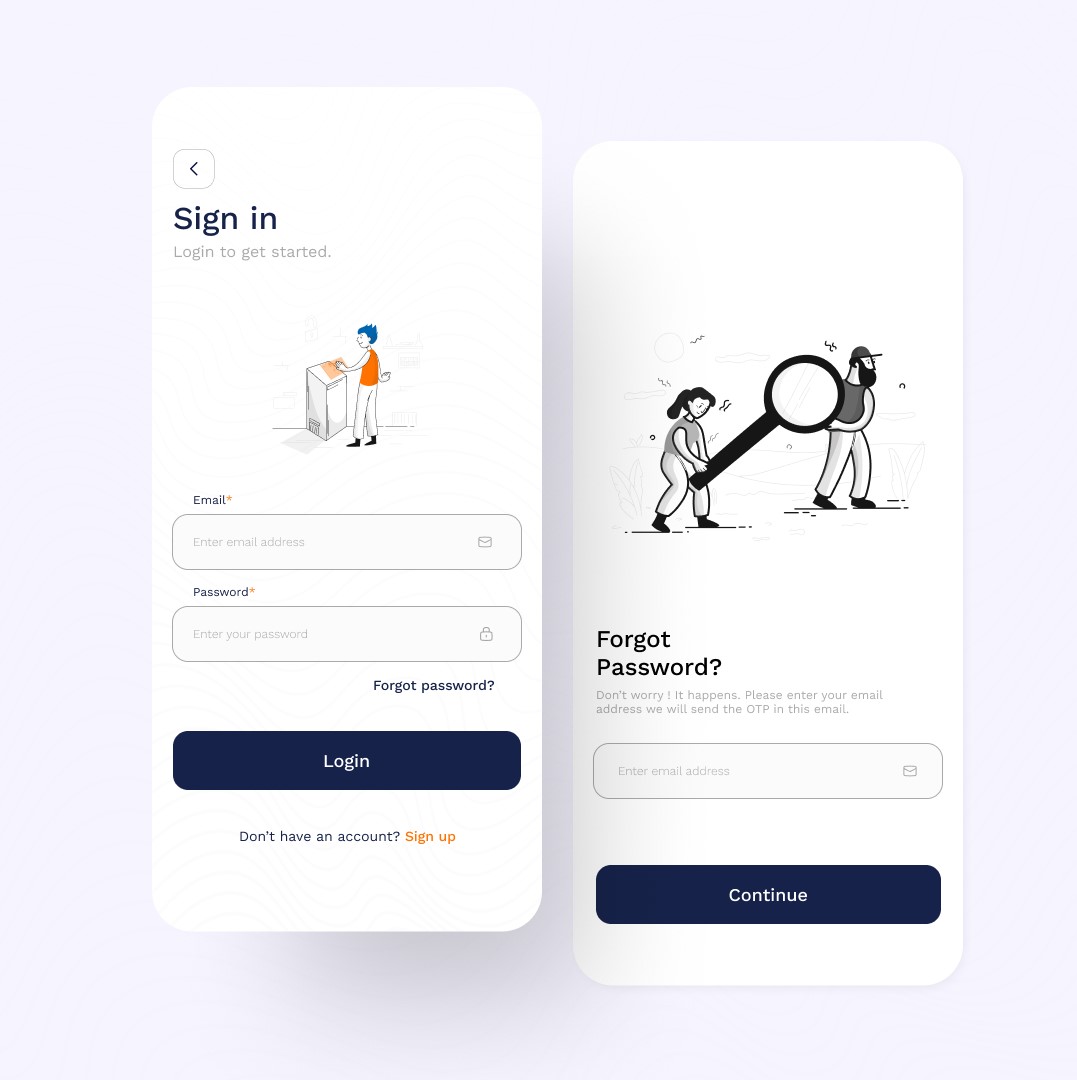 I got inspiration from the company's branding while trying to generate colors for the app's interface. I used clean and simple icons for the ui and I wanted the illustrations to come from a single pack and that was really hard to accomplish since we didn't have the budget to buy a premium illustration pack.